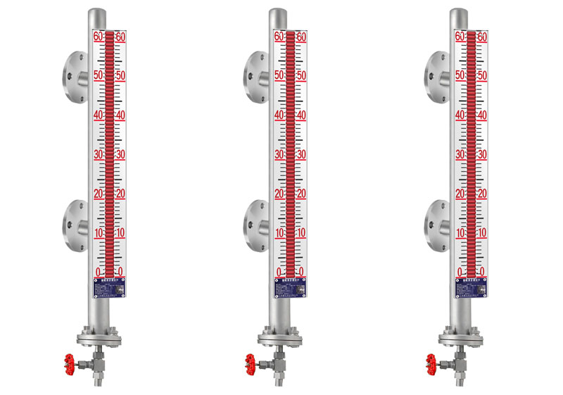 液位計由連通器、主導管、磁性浮子、現場指示牌,及捆綁式液位變送器或液位開關組成。本產品利用的基本原理是阿基米德原理(浮力原理)及磁荷同性相斥、異性相吸的特性。當主導管內磁性浮子隨液位升、降時,通過磁耦合驅動指示器內磁翻板翻轉,實現就地觀測和信號遠傳顯示。